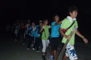 「100kmウォーク研修」を行いました。 富山大学から四方の海へ出ました。 その後は海岸沿いをひたすら歩きました。 富山新港の渡し船にのったり、ひろった針と糸で釣りをしたり、 新湊や伏木の港町の景色を楽しみながら、 1日目の宿泊地である松太枝浜キャンプ場へ。 全員で一列になって、いつもうたっている「にじ」をうたいながら 元気に歩いて到着しました。 2日目は朝5:30に出発。 歩いていると地元の方からコーヒーをいただいたらしく、 人のあたたかさに感謝するリーダーの声を聞けました。 この日も30℃をこえる暑さの中、ひたすら海沿いを歩きました。 休憩や昼食、夕食で会う度に疲労の色が濃くなっていきました。 腹痛や足の痛み、睡魔と戦いながら、ゴール直前の能登島大橋へ。 ひみこやあるじゃんもサポートに加わり、クライマックスへ。 ゴール地点で待つこと数時間。。。 夜もふけきった午前4時前、 全員で手をつないでゴール! 感動の瞬間でした。 たくさんのリーダーの目に熱い涙が光っていました。 お互いをたたえあい、抱き合って泣きました。 この研修でリーダーが感じたこと、得たもの、多くあったと信じています。 忍耐、 やさしさ、 仲間、 元気、 感謝、 自信、 絆。 僕自身、挑戦する若者たちの姿に感動して胸があつくなった幸福な3日間でした! |